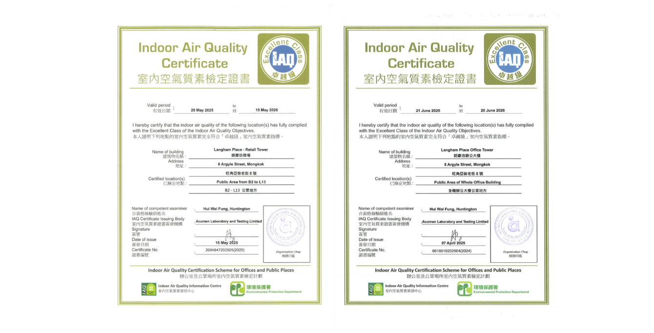 Langham Place Shopping Mall and Office Tower received the “Excellent Class” Indoor Air Quality Certificate in recognition of our success in ensuring a pleasant indoor environment. The certified premises include the public areas of Langham Place Shopping Mall and the entire Office Tower building.