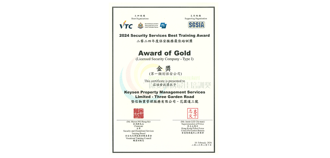 We are proud to announce that Keysen Property Management Services Limited- Three Garden Road has been awarded the Gold Award in the 2024 Security Services Best Training Award, jointly organised by the Security and Discipline Services Training Committee of the Vocational Training Council (VTC) and the Hong Kong Police Force Crime Prevention Bureau. The Award recognises our continuous commitment and outstanding performance in security training, professional development, and service quality enhancement.
