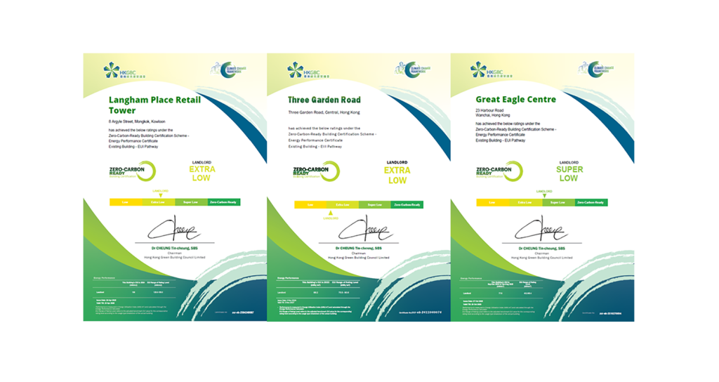 朗豪坊、花園道三號及鷹君中心分別參與由香港綠色建築議會(HKGBC)推出的 「零碳就緒建築認證計劃」,並於2025年11月26日的「零碳就緒建築認證」頒授典禮中,鷹君中心首次榮獲 「超低耗能」 評級,而朗豪坊和花園道三號則榮獲 「特低耗能」 評級。